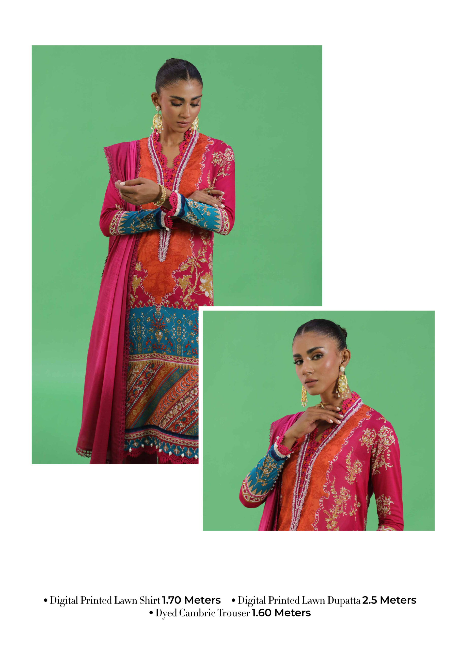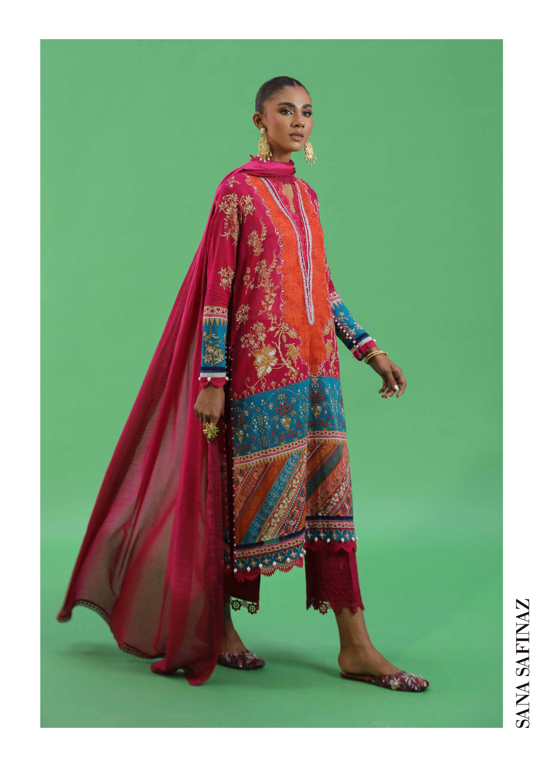 Unstitched 3-piece suit from Sana Safinaz with a digitally printed lawn shirt (1.7m), floral maroon printed dupatta (2.5m), and dyed cambric trousers (1.6m). A perfect fusion of traditional and modern design.