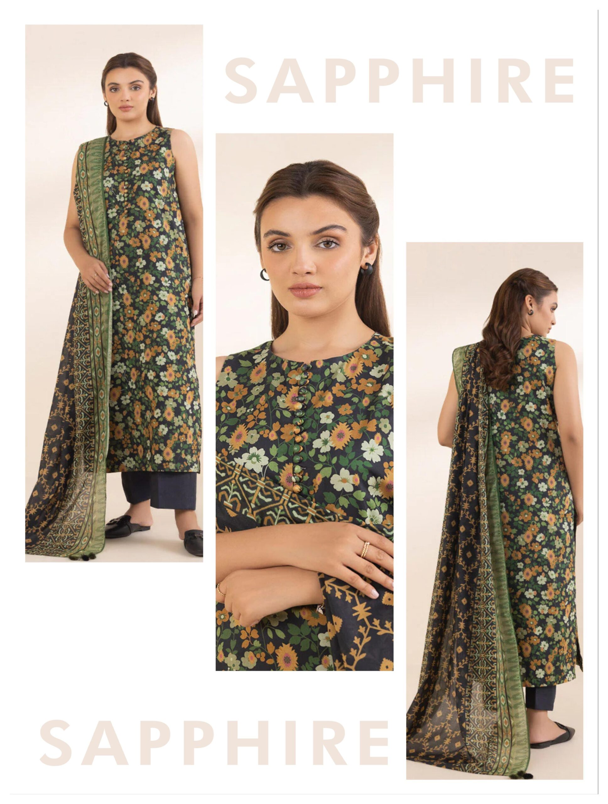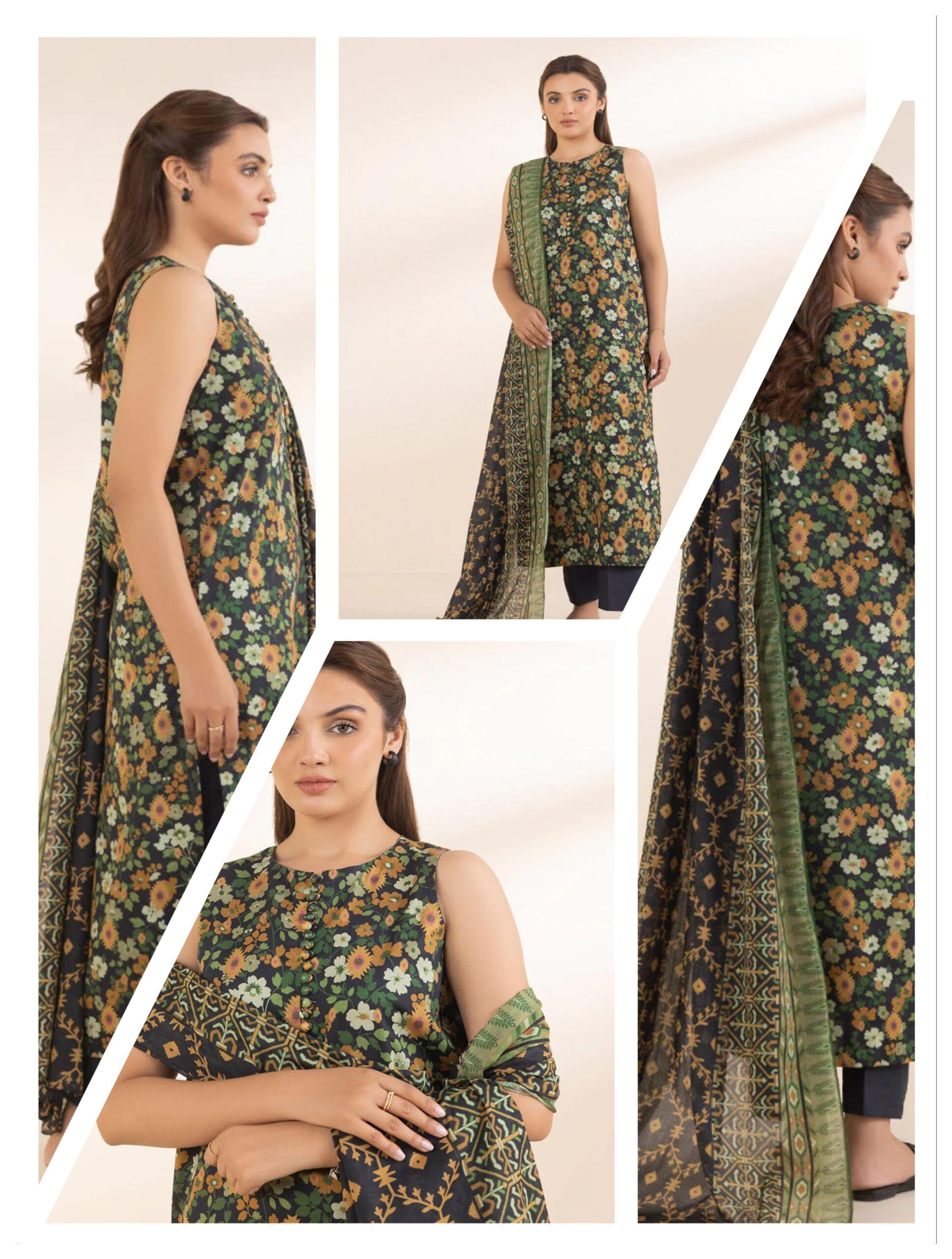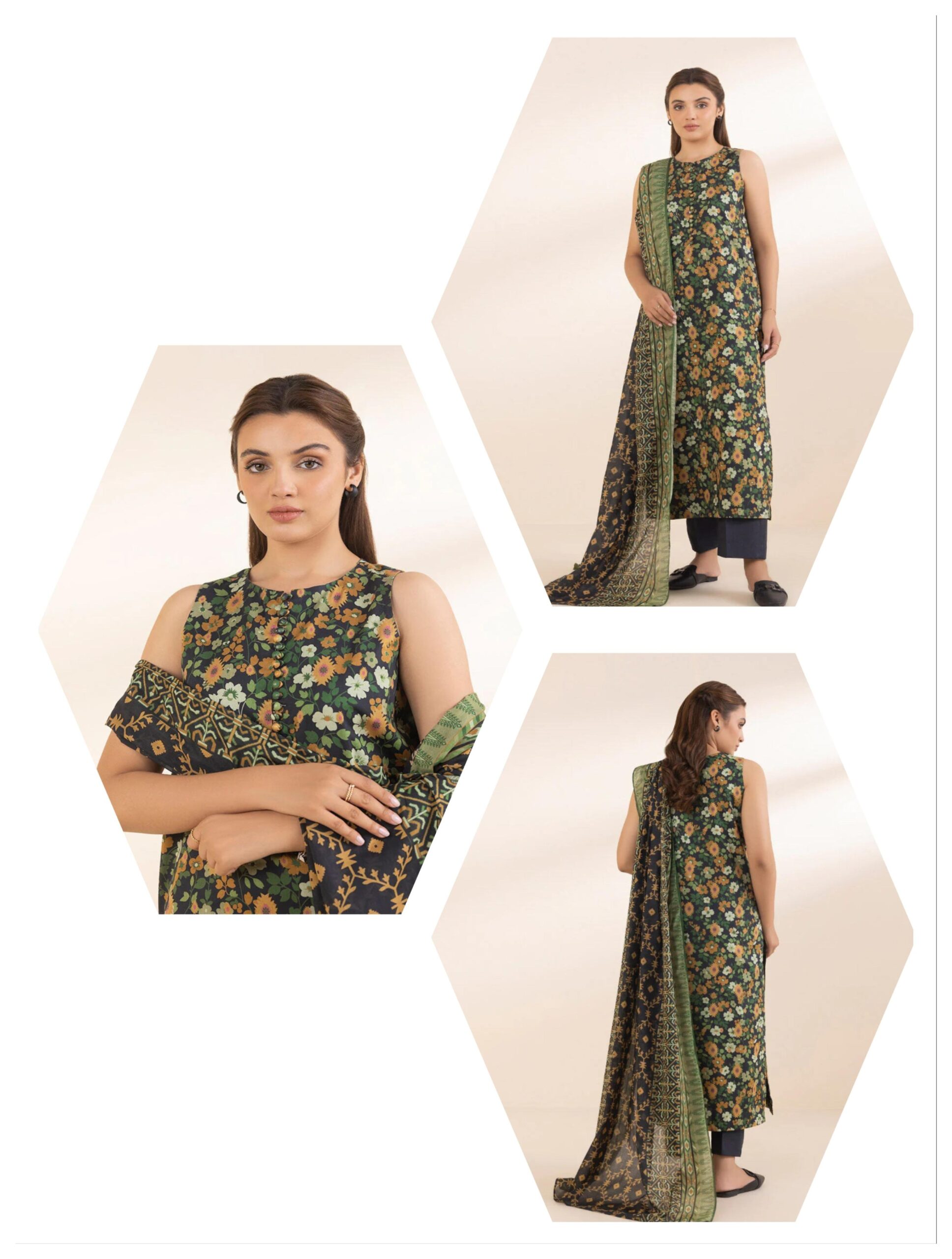 Dupatta: The lawn dupatta adds a graceful contrast with oversized floral motifs in muted shades of sweet potato, green, and black and slaty white, enhancing the overall elegance.