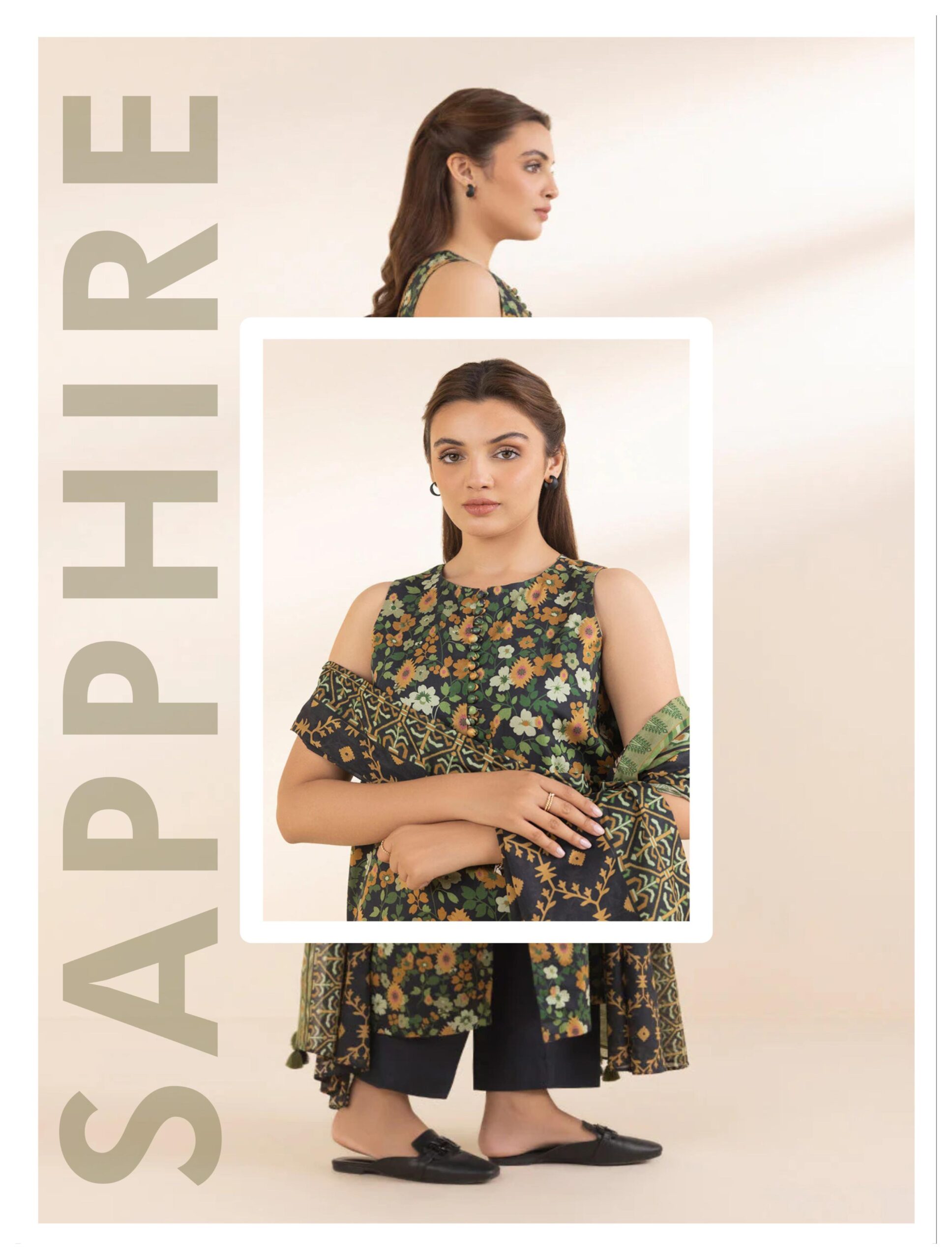Shirt: Made from premium lawn fabric, the shirt features an all-over floral print in soft green and sweet potato hues against a black base. Its straight silhouette with a slit neckline and elasticated sleeves gives it a refined yet modern finish.