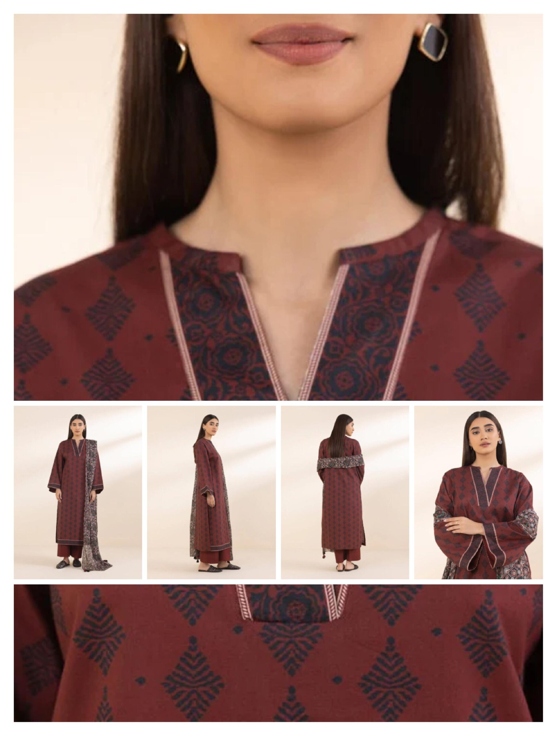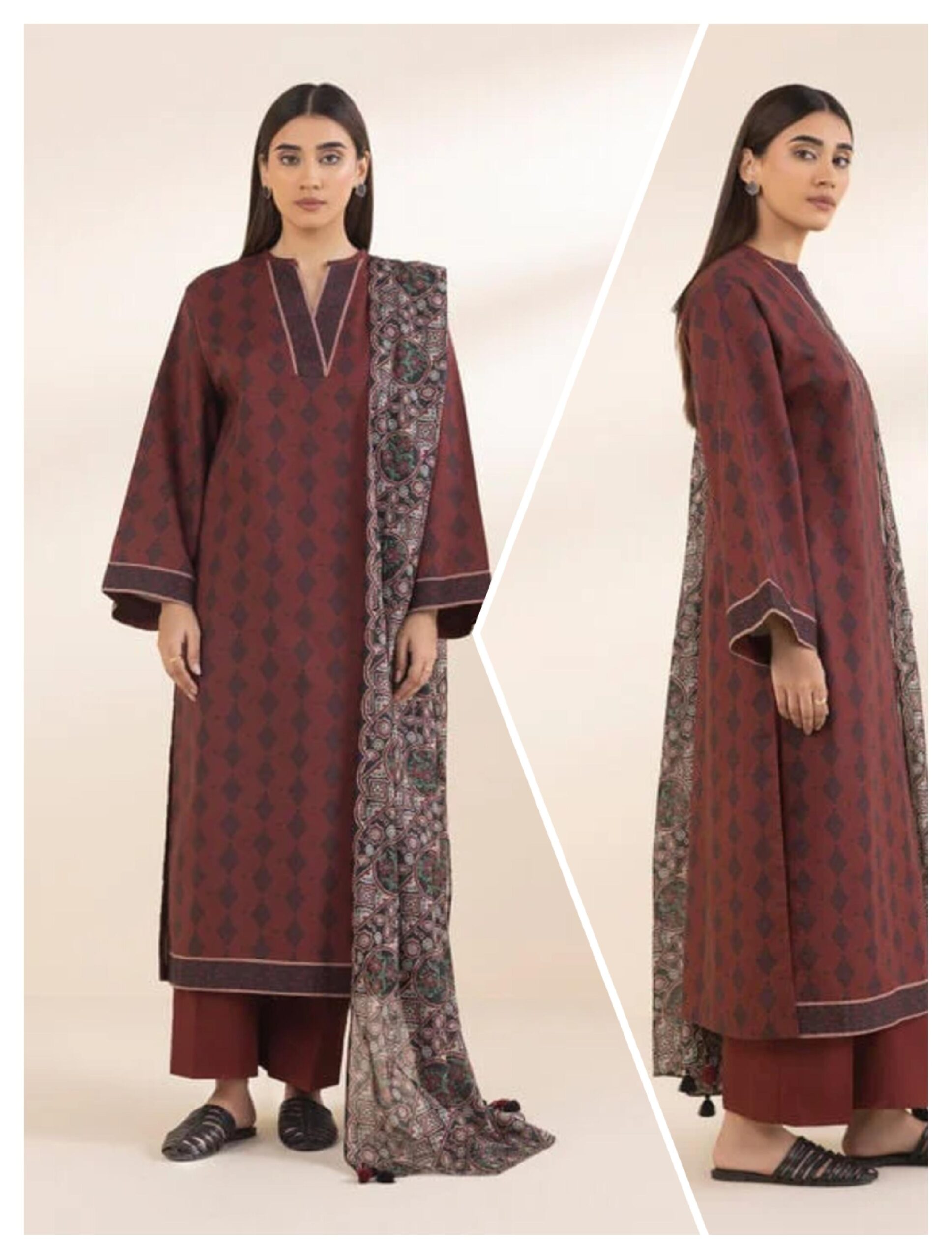 A timeless maroon outfit enhanced with geometric and traditional patterns. The earthy tones and rich prints make it perfect for both daytime wear and evening gathering.